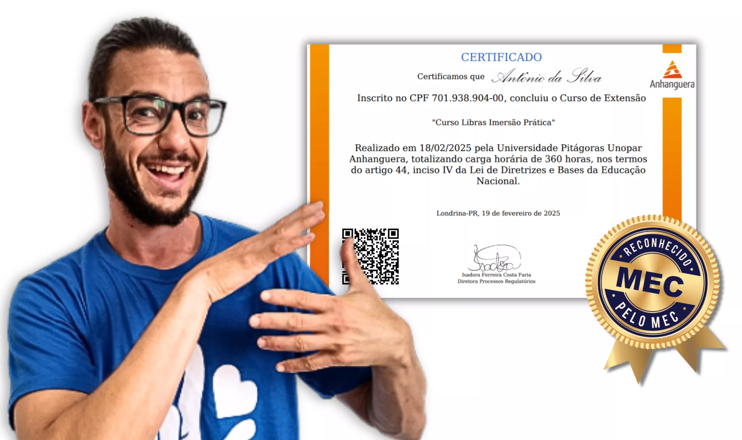 Você recebe certificado reconhecido pelo MEC com 360 horas para aproveitar todas as oportunidades que a Libras tem para te oferecer.